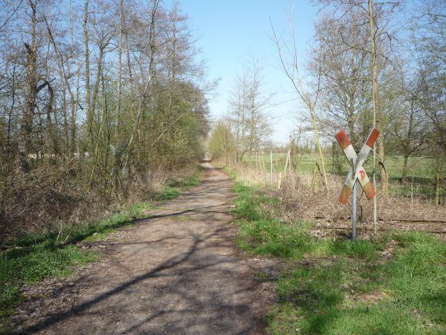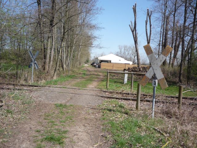 Direkt vor diesen Bahnübergang biegt die Strecke wieder um 90° nach Osten ab und überquert am 4. Bahnübergang erneut