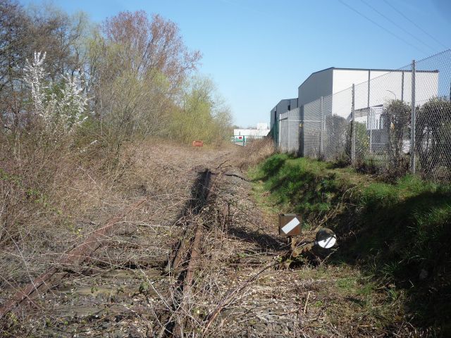 Das geradeaus führenden Gleis ist stark überwachsen, es ist nicht mehr erkennbar wo es heute